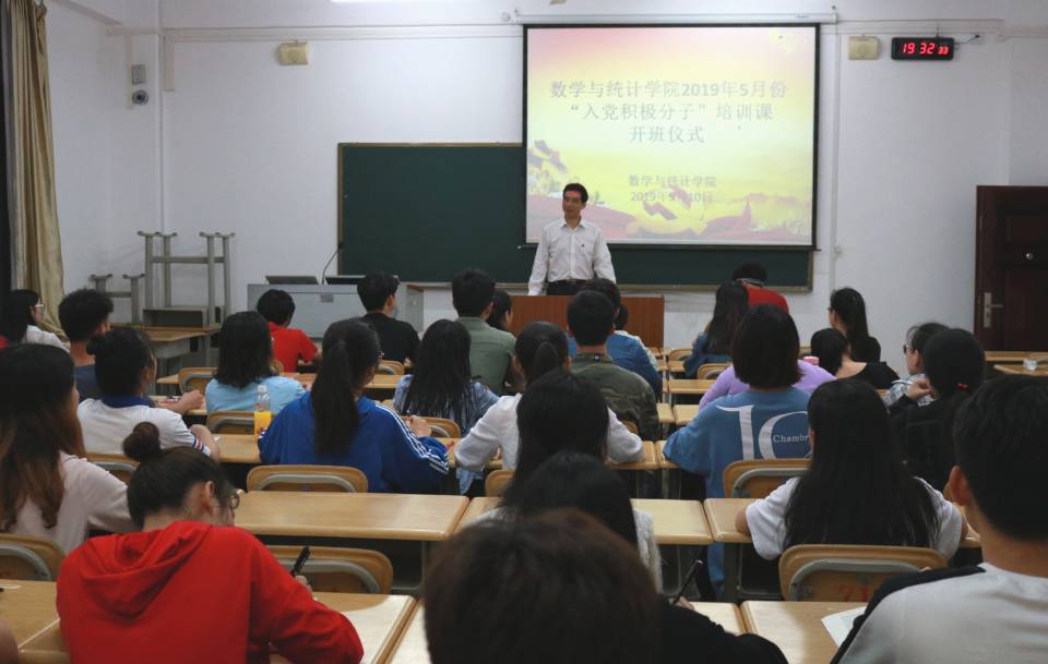 为帮助广大入党积极分子深入学习习近平新时代中国特色社会主义思想,系统了解党的基本知识,准确把握党的基本理论、基本路线、方针、政策,端正入党动机,提高政治思想觉悟,数学与统计公司2019年上半年入党积极分子培训班于5月10日晚在西区格致楼708教室顺利开班。公司党总支部书记黄星寿、团委书记罗曼及66名入党积极分子参加此次开班仪式。