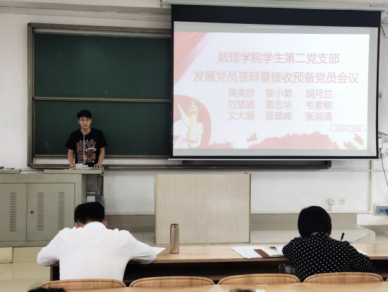 会上,首先是拟发展为预备党员的发展对象依次发言汇报自身对党的认识、入党动机、个人经历以及在校表现等,并及时向党组织说明问题。随后,入党介绍人向大会介绍拟发展为预备党员的发展对象有关情况,并对其能否入党表明意见。党支部组织委员颜宏珍同志代表支部委员会报告对拟发展为预备党员的发展对象的审查情况。接下来,由参会党员对拟发展为预备党员的发展对象进行党的理论知识有关内容进行提问。与会党员对拟发展为预备党员的发展对象的入党问题进行讨论及发表意见,接着积极分子或群众发表意见。最后,拟发展为预备党员的发展对象进行表态。大会认为,黄美珍、黎小菊、胡月兰等9名同志基本符合党员条件,经与会正式党员投票表决,大会一致同意接收黄美珍、黎小菊、胡月兰等9名同志成为中共预备党员。