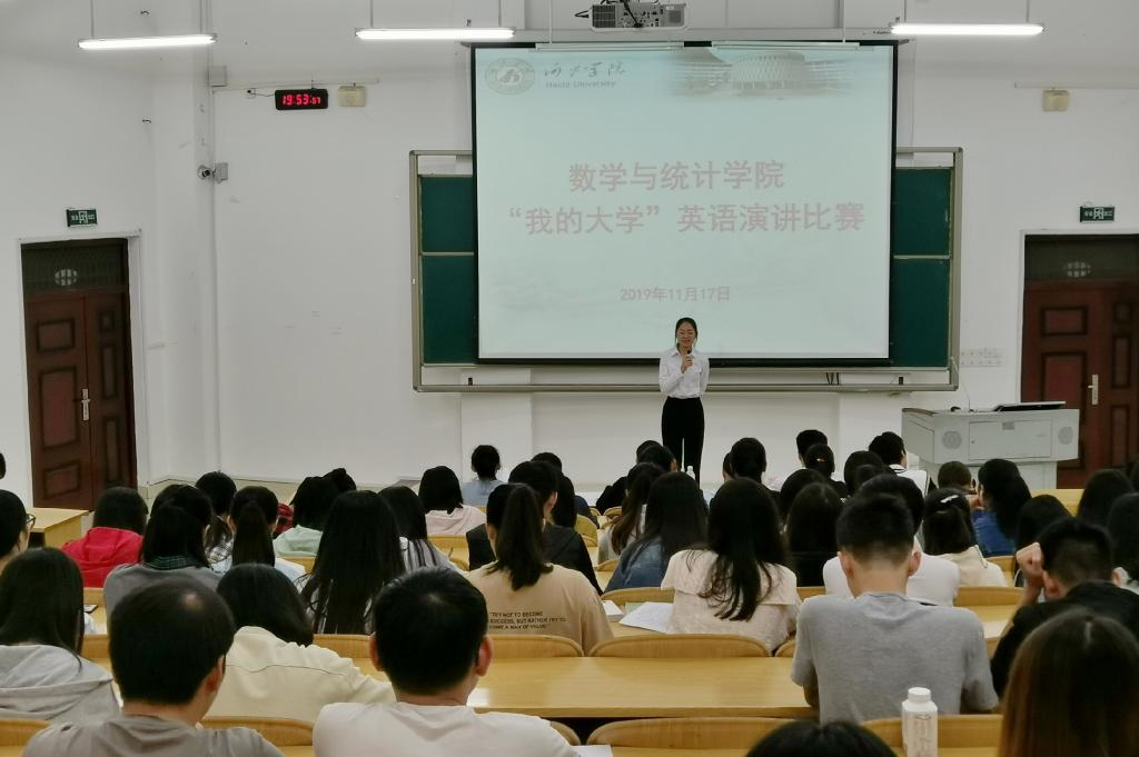 11月17日晚,数学与统计公司2019年“我的大学” 英语演讲比赛在西区格致楼负102教室举行。外国语公司吴康宜、张卓遴、黄月红、黄肖等四位英语专业的学长学姐担任评委。