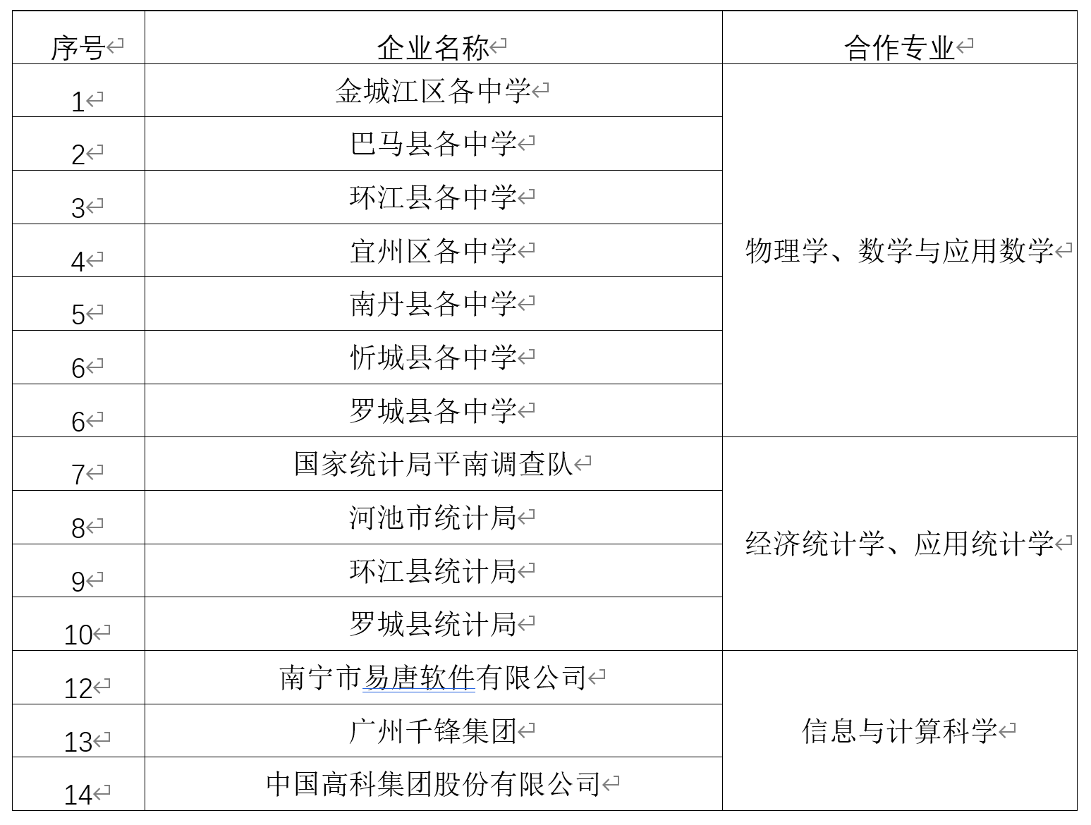 公司坚持开放办学,积极融入到“没有围墙的大学”建设中。近年来,公司先后与国家统计局平南调查队、河池市统计局、环江县统计局、罗城县统计局、广州千锋集团、南宁市易唐软件有限公司等多家单位建立了产学研合作关系,与周边各个中小学建立教学实习实训合作关系,为员工提供良好的实践平台。