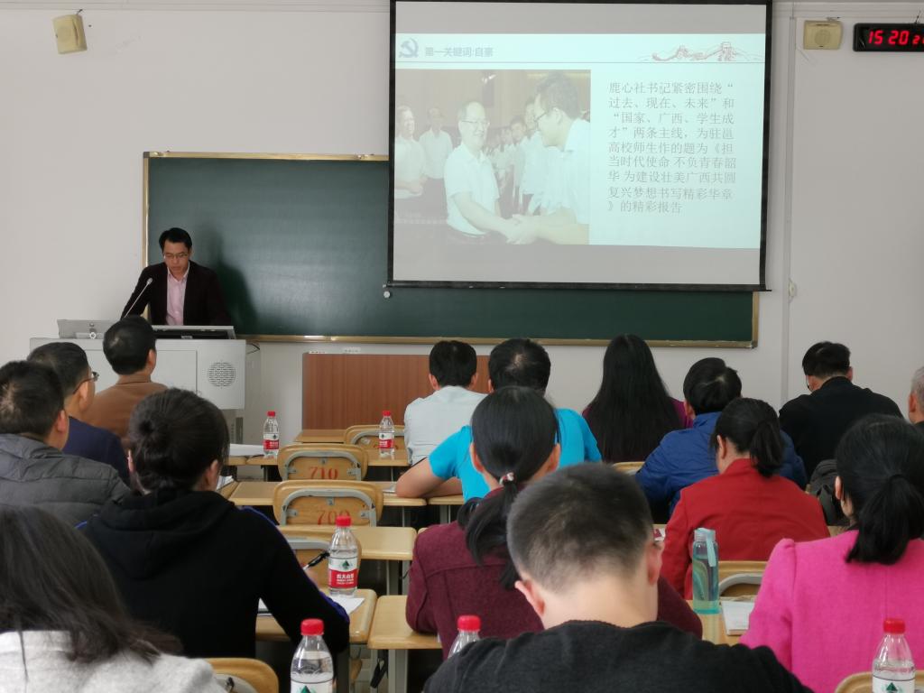 2019年10月30日下午,数统公司在西区格致楼710教室组织全体教职工学习贯彻自治区党委书记、自治区人大常委会主任鹿心社在广西大学形势与政策报告会上的讲话精神,会议由公司党总支书记黄星寿主持,公司党总支副书记张明进主讲。