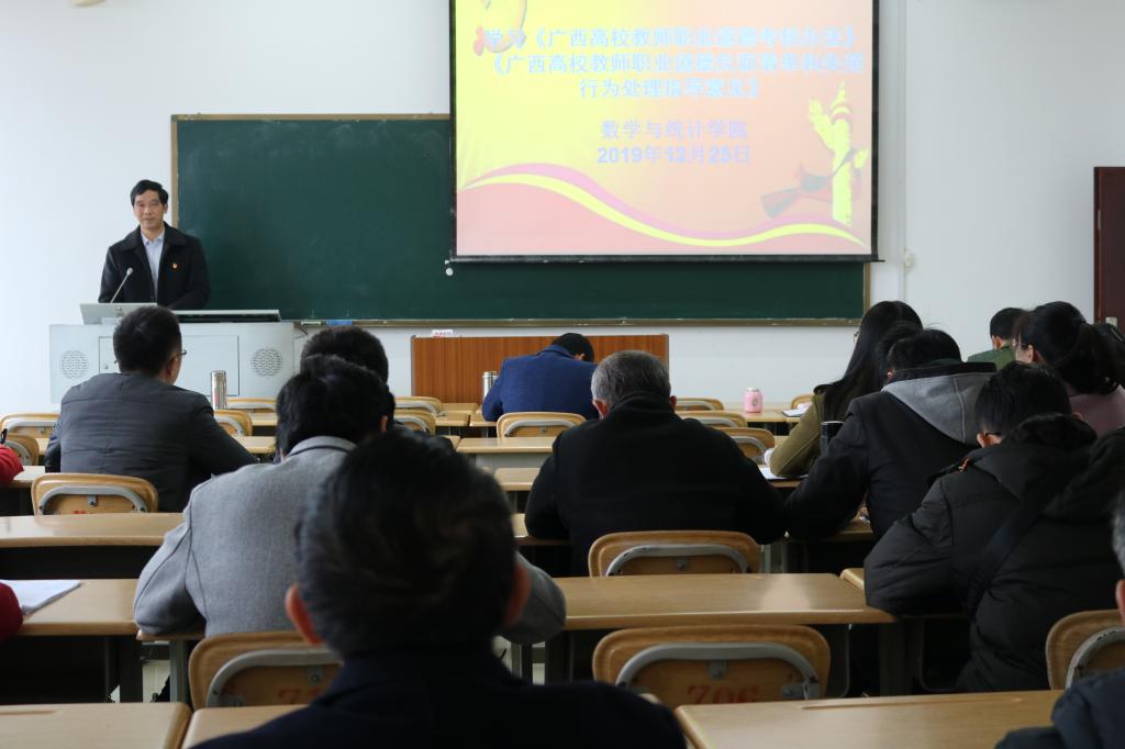 为推进公司师德师风建设,提升教师思想政治素质和职业道德修养,规范教师教学、科研、管理、服务工作和生活行为,建设高素质教师队伍。12月25日下午,数统公司在格致楼710教室召开师德师风专题理论学习会,专题学习《广西高校教师职业道德考核办法》(以下简称《办法》)和《广西高校教师职业道德负面清单和失范行为处理指导意见》(以下简称《意见》)等文件精神。会议由公司党总支部书记黄星寿主持,数统公司全体教职工参加会议。