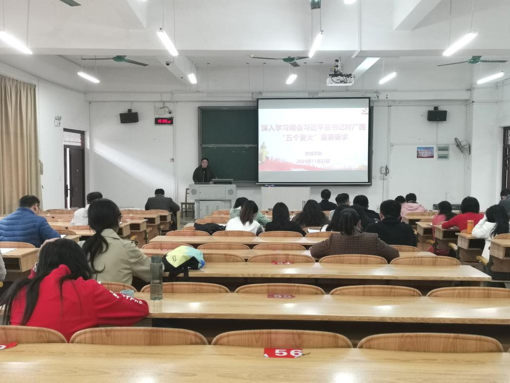 11月22日,williamhill在弘毅楼2-104教室召开学习贯彻习近平总书记对广西“五个更大”重要要求学习会,学习会由公司党委书记罗美金主持,公司全体教职工参加学习会。
